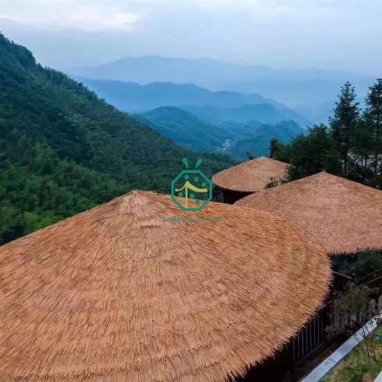Synthetic thatch roof materials are easy installation, flame retardant, free maintenance and high aesthetic value for hotel villa decoration.The assembly process of the fake thatch roof tiles is similar to that of natural straw roof, by superimposing strips, overlapping them from the eaves to the ridge.
