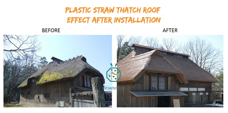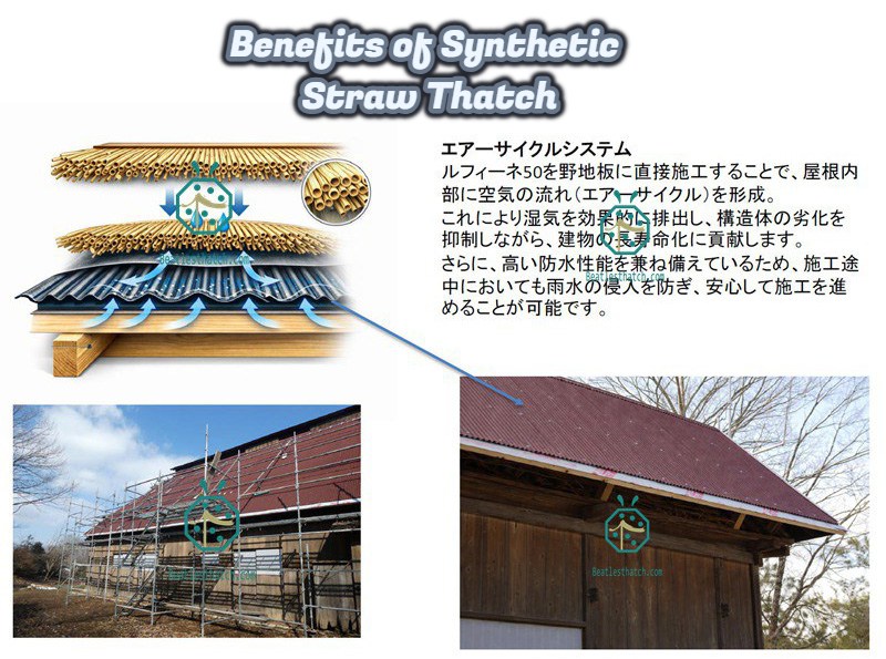 The completed roof presents a remarkably smooth, uniform appearance that surpasses traditional natural thatch in aesthetic consistency and durability. Unlike organic materials vulnerable to rot and weathering, our synthetic solution offers decades of maintenance-free performance while preserving authentic Japanese architectural character.